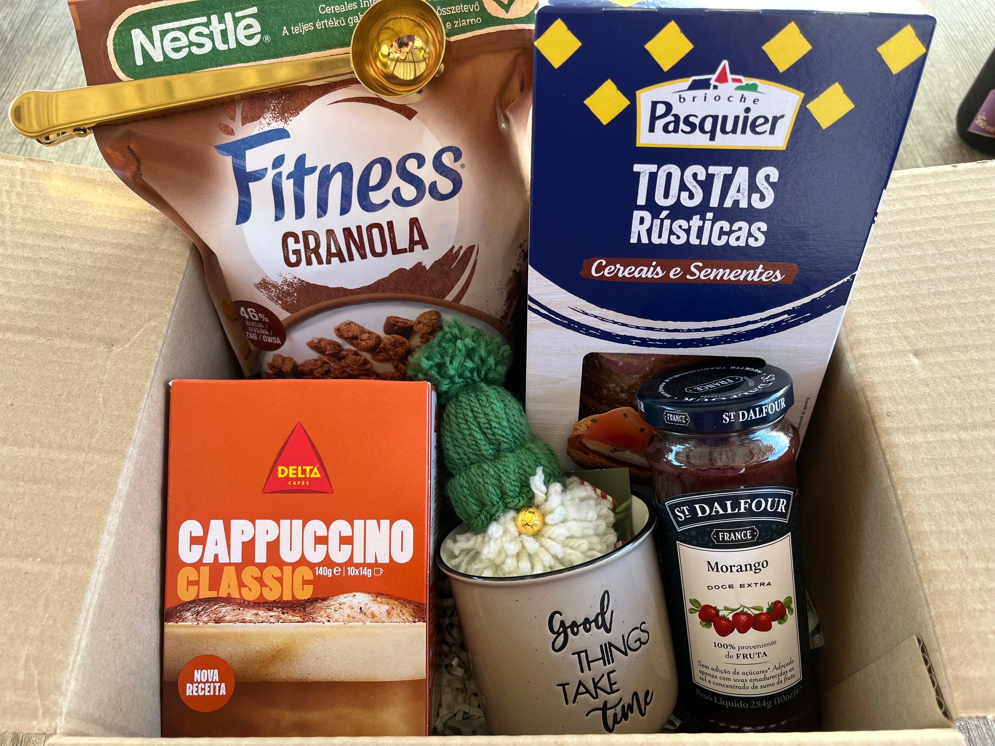 Mantemos sempre o conceito e o tipo de produto descrito (por exemplo: chá + bolachas + doce), mas as marcas, sabores e embalagens podem variar consoante a disponibilidade em stock.