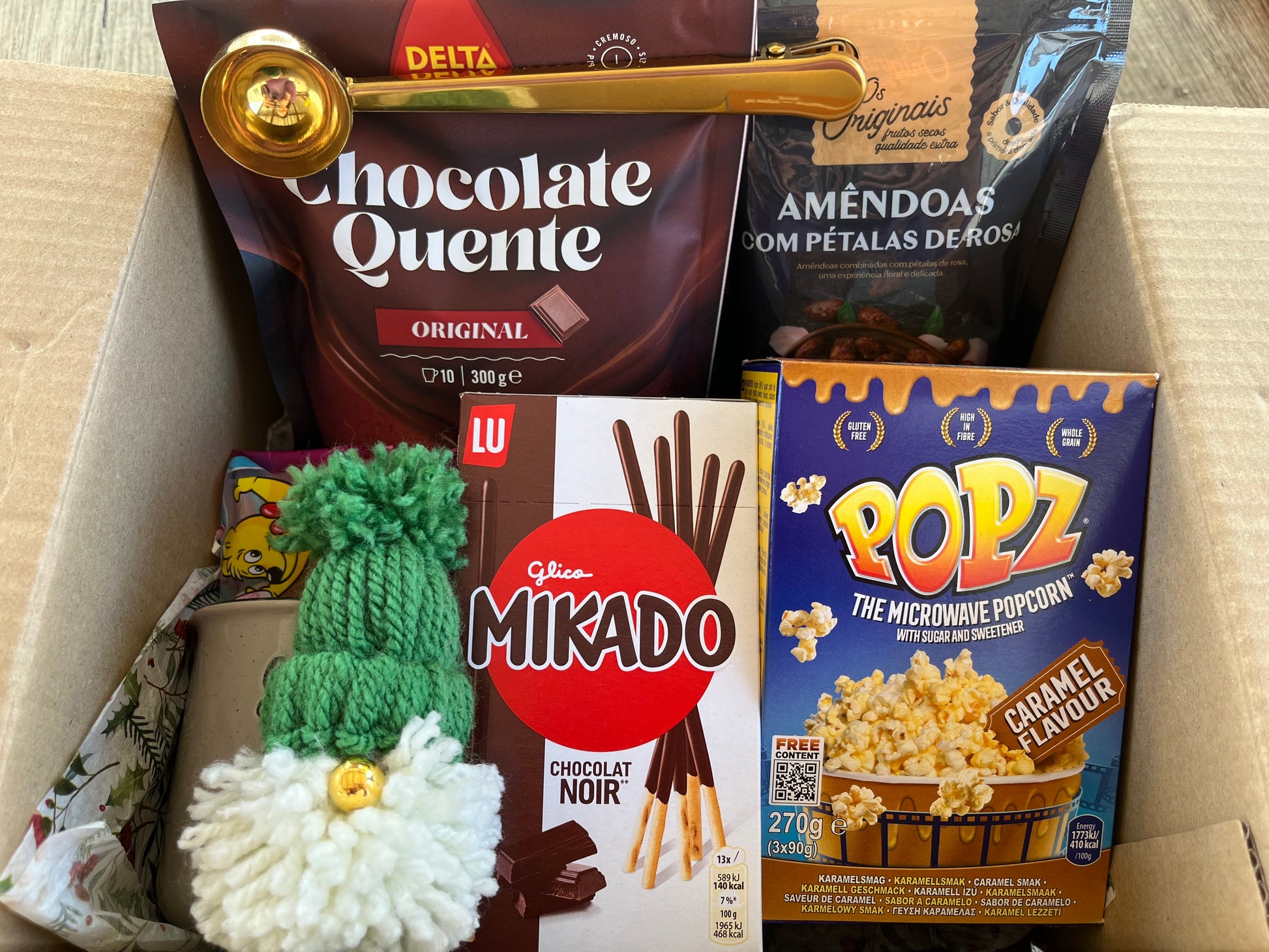Cada cabaz vem preparado à mão, com direito a cheirinho a gingerbread, Pai Natal de lã feito à mão e raspadinha com mensagem secreta personalizada.